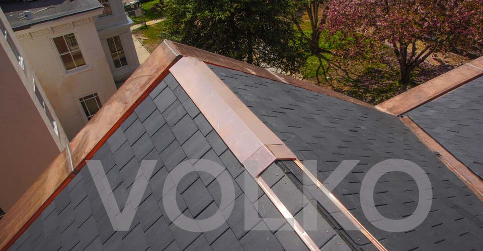 traditional finish for a slate roof ridge was rolled copper or galvanized.
